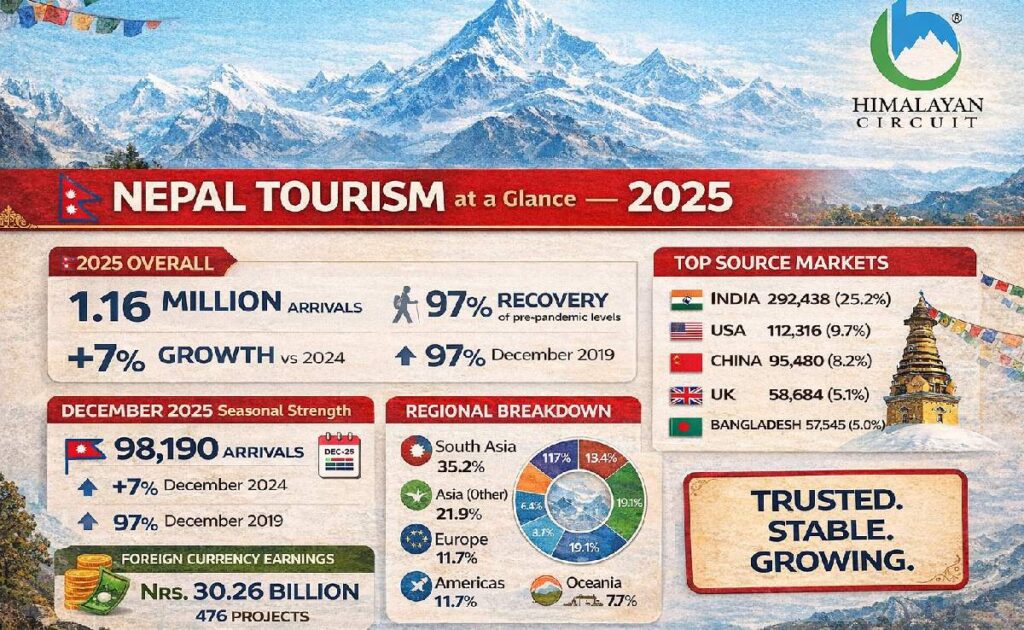 Tourism in Nepal demonstrated strong resilience and maturity in 2025, successfully reaching near pre-pandemic performance levels while avoiding the pitfalls of mass tourism. According to data and industry insights aligned with the Nepal Tourism Board, Nepal welcomed 1,158,459 international visitors, achieving a 97% recovery compared to 2019.