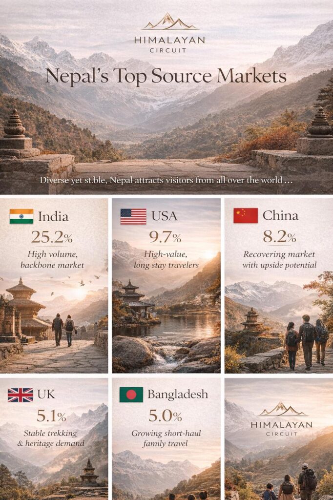 Nepal benefits from a diversified source market mix, which reduces dependency risk. However, while India dominates in volume, long-haul travelers from the USA and Europe contribute disproportionately to tourism income.